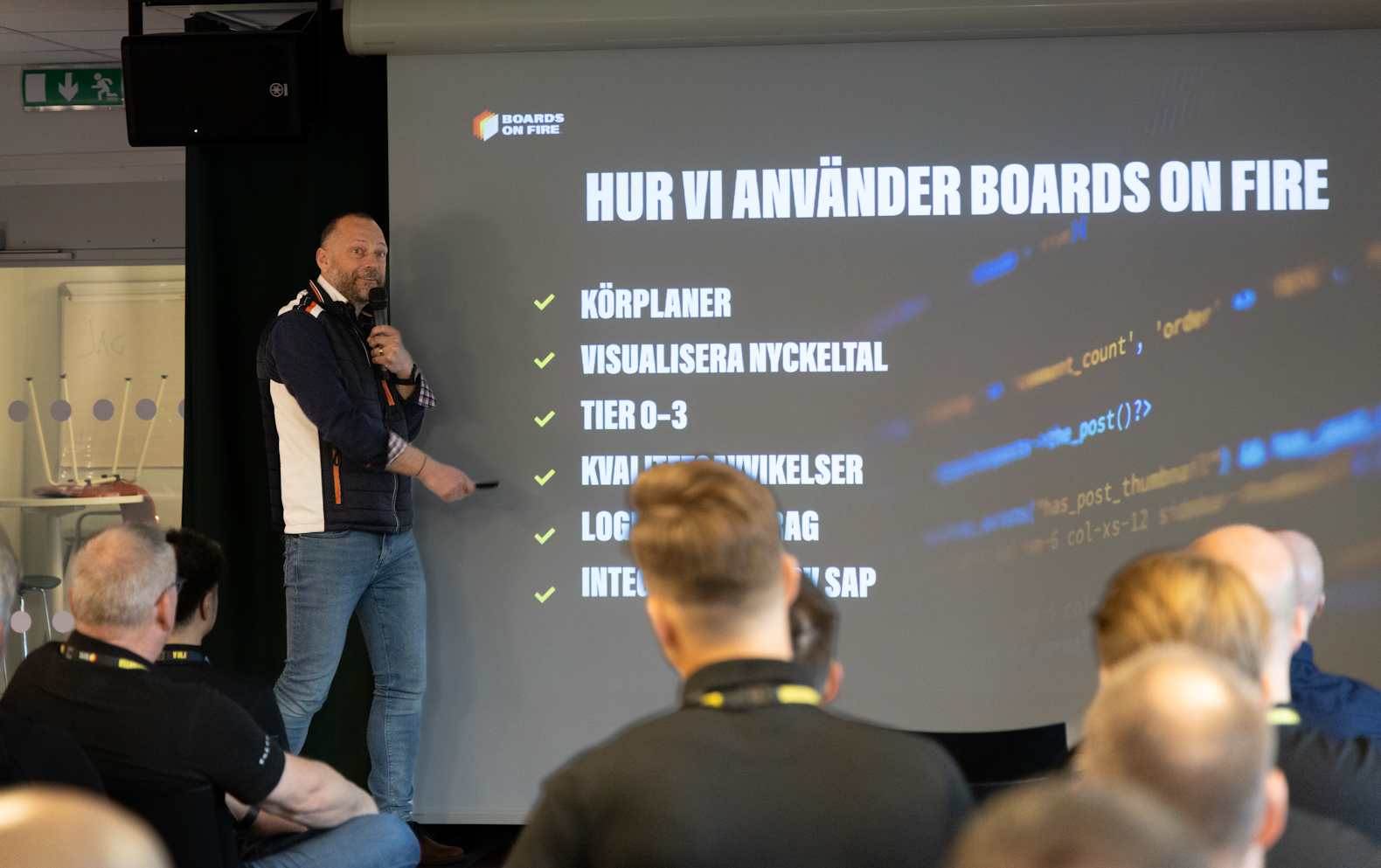 The day featured inspiring presentations from several of our customers, including Holtab, Sulzer, Swecon Anläggningsmaskiner AB, and Bruzaholms, who shared how they use Boards on Fire in their daily work. On our side, our CEO, Customer Success team, and development team contributed valuable insights and future perspectives. This included an overview of Boards on Fire’s journey, as well as how the Customer Success and development teams operate.