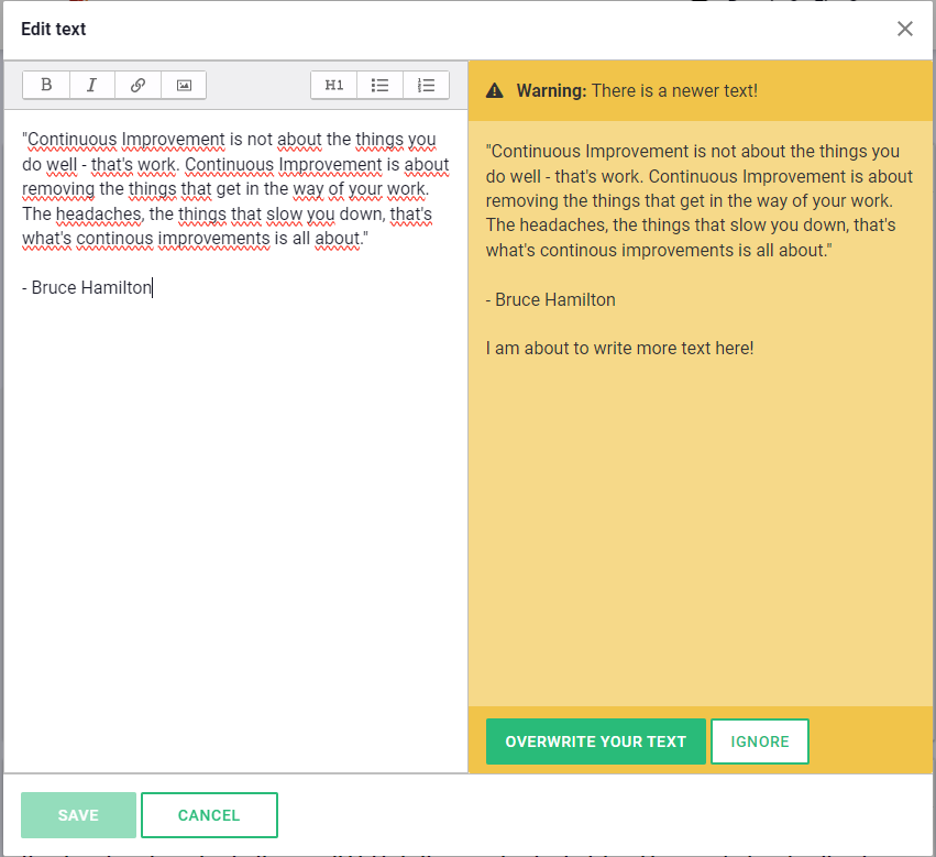 When someone else is working in the same board and makes changes to a text, it is now clear when you are in editing mode. You can then choose how you want to handle the incoming text. You can either overwrite your own text with it, ignore it, or select parts of the new text and paste them into your text.