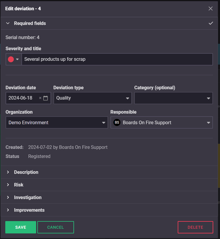 Now you get the entire flow from deviation to implemented improvement in Boards on Fire. Create the deviation based on a component in Boards on Fire, maybe a deviating KPI figure, and follow the entire deviation flow. Then create improvement actions to ensure that the deviation does not occur again! Everything is interconnected, and you can see the link between deviations and improvements.