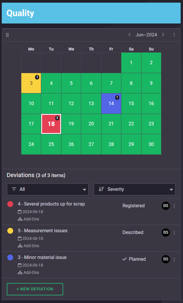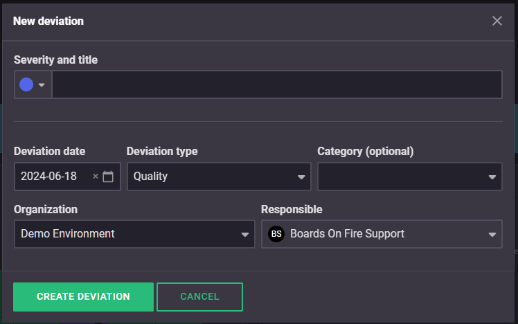 We have built this module with all tiers in mind. We want to capture all the organization's deviations – and that requires a simple but seamless form! Therefore, the creation flow is very easy. Select the component that handles the type of deviation you want to register (e.g., Quality) and click “+ New deviation.” Here, only a Severity level and title need to be filled in – then the deviation can be created!
