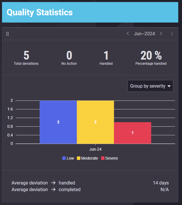 In addition to the deviation module, we added a component for deviation statistics. Now you can see how many deviations have been registered and handled. They can also be grouped in different ways. In the fall of 2024, we will further develop this with an additional view for more detailed statistics.