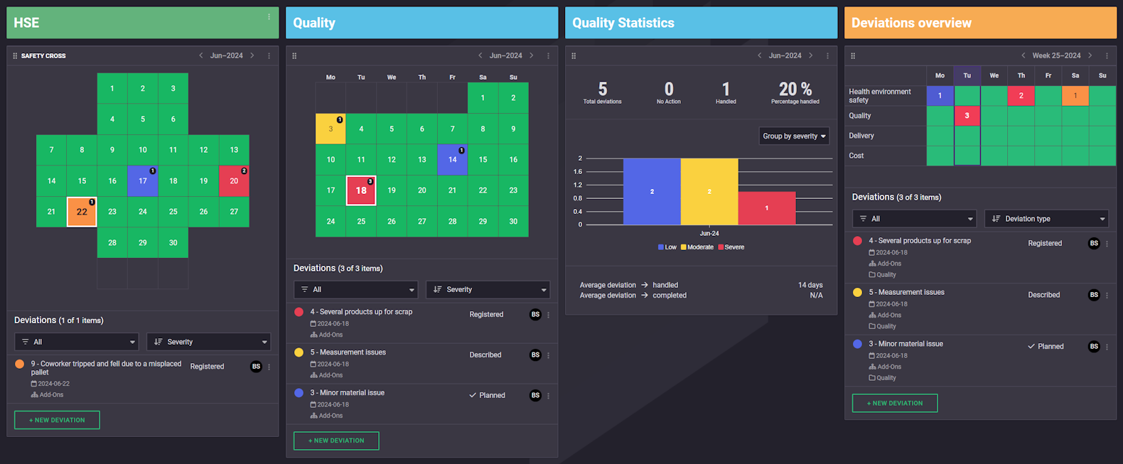 Deviations can be managed in several different views, such as the classic Safety Cross, calendar view, or an overview view.