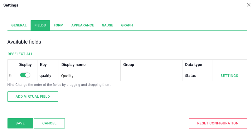 Here, the fields from the selected data source are displayed, and you can adjust their settings to customize how they are used: