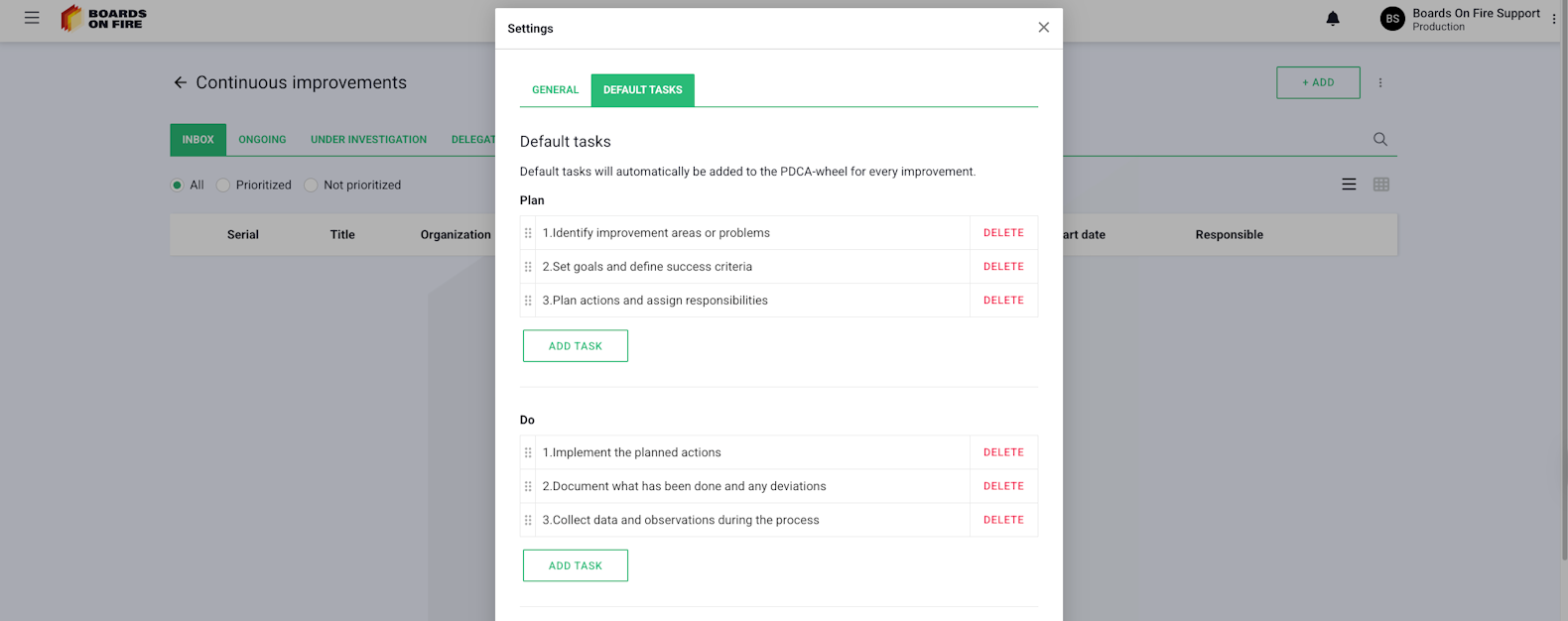 If you want to use. default tasks in your PDCA linked to improvement work, there is a special function for this. The tasks are organization-bound (or department-bound), meaning they are managed at the departmental level. The default tasks you create will therefore be available within the department you are in, but not for the entire organization. In this way, each department can adapt its tasks to its own working methods and needs. Go to the menu in the upper left and select the “Continuous Improvement” module. Click “Settings” in the upper right. Select the “Default tasks” tab. Here you can then input default tasks for each phase of the PDCA, which makes it easier to follow the process and ensure that no important steps are missed.