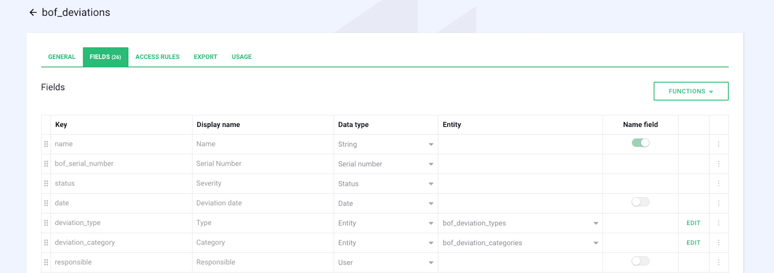 Then go to the “Fields” tab and click “Edit” to the right of the “deviation_types” field.