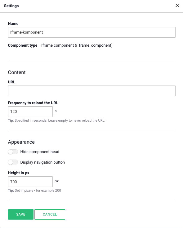 In the settings for the Iframe component, you enter the URL of the location you want to display in the component. You can also set a time interval for how often the URL should be refreshed. The settings include an option to display a navigation button. This adds a green button with the text "Open Page" on top of the document. When you click this button, the location visualized in the Iframe component will open. This serves as a shortcut to access the webpage or document directly.