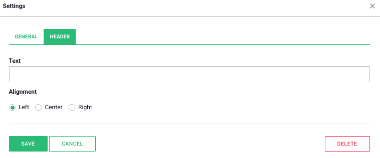 If you select the “Header” option, a new tab named “Header” will appear in the settings (see the image below). In the “Text” field, you specify the content of the header, and under “Alignment” you choose its position.
