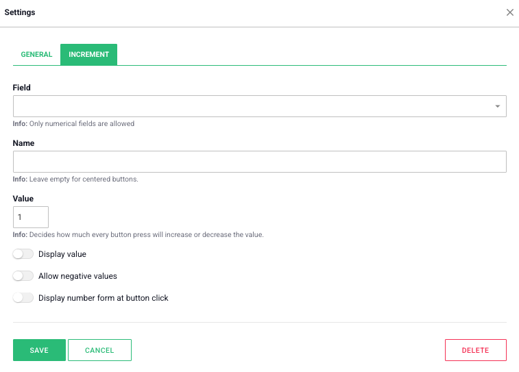 If you check the “Allow negative values” box, the value in the field can be lowered below zero. If you instead select “Show number form upon button press”, a form will appear when a user clicks one of the buttons.