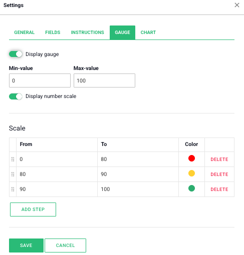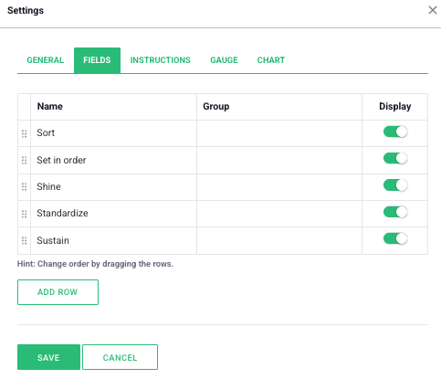 If you prefer to create a checklist where tasks or questions are scored, you can use the “Fields” tab to name each question or item, if this has not already been done in the data source. Here, you can also set minimum and maximum values for each question.