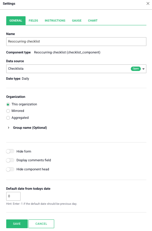 In the settings for the Recurring Checklist component, you select the desired data source and decide whether the data should be aggregated or remain within the selected organization only.