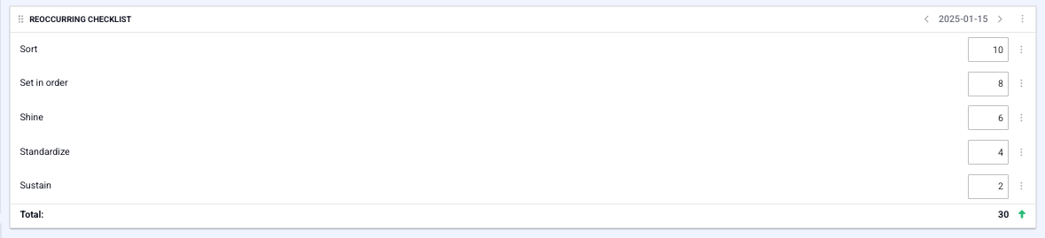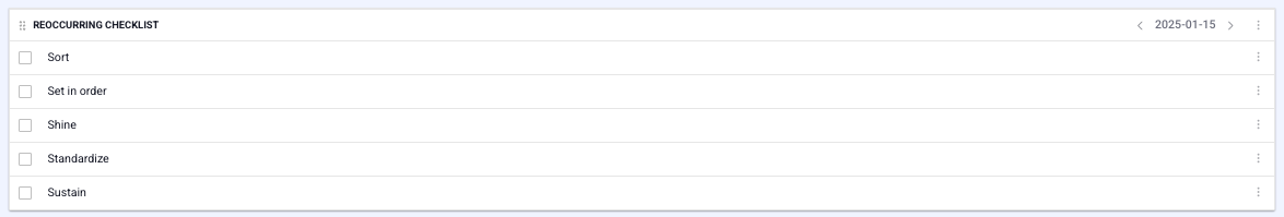 The recurring checklist is primarily used to create structured lists for tasks such as 5S activities, audits, questionnaires, or other routine checks. These checklists can be scheduled to be completed daily, weekly, or monthly.