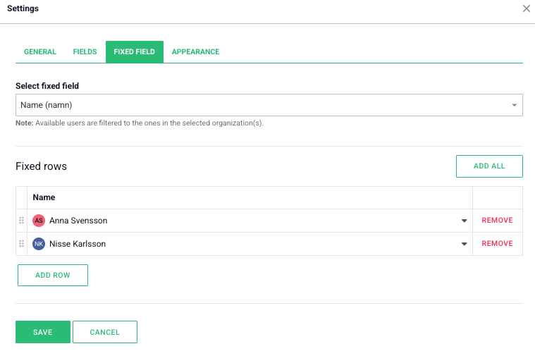 Once the data source has been created and selected in the component, a fixed field needs to be chosen. This field must be of the data type User, Organization, or Entity, as mentioned above. When selecting the User data type, you will be able to add individual employees to the lists, provided that the desired staff members are included in the lists. If Organization is selected as the fixed field, an organization can be chosen for the rows. When selecting Entity, a list of different labels can be created and then added to the rows in the component. Once a fixed field is selected, you can add, for example, employees if the User data type has been chosen.