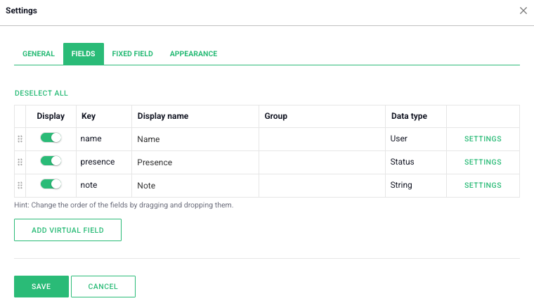 If other fields are desired, you can easily add or remove them in the data source. The only requirement is that at least one field has the data type User, Organization, or Entity. When you access the “Fields” tab in the component’s settings, the fields from the selected data source will be displayed. To add new fields or delete existing ones, these changes must be made directly in the data source.