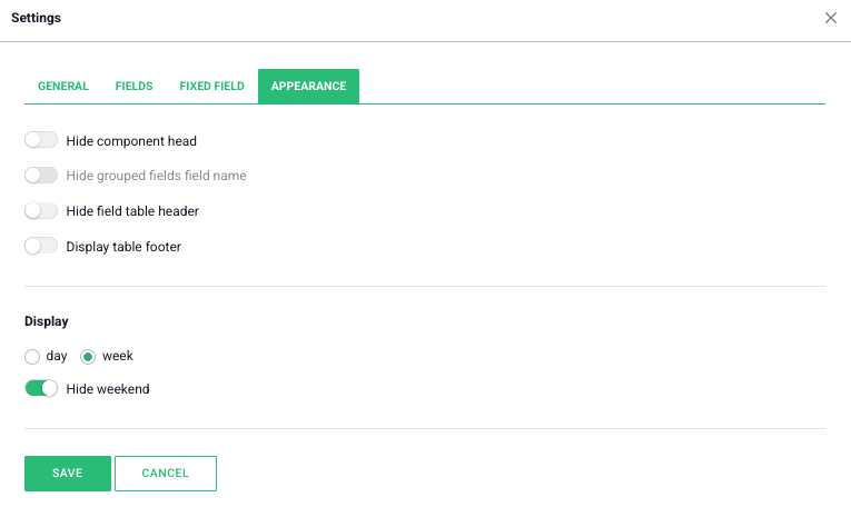Under the “Appearance” tab, you can configure the component to display either daily or weekly data. If you choose to display a week’s data, the weekend can be hidden if desired. There is also a setting within the data source where precision can be selected. However, these should be distinguished as they will provide two different appearances and functions.