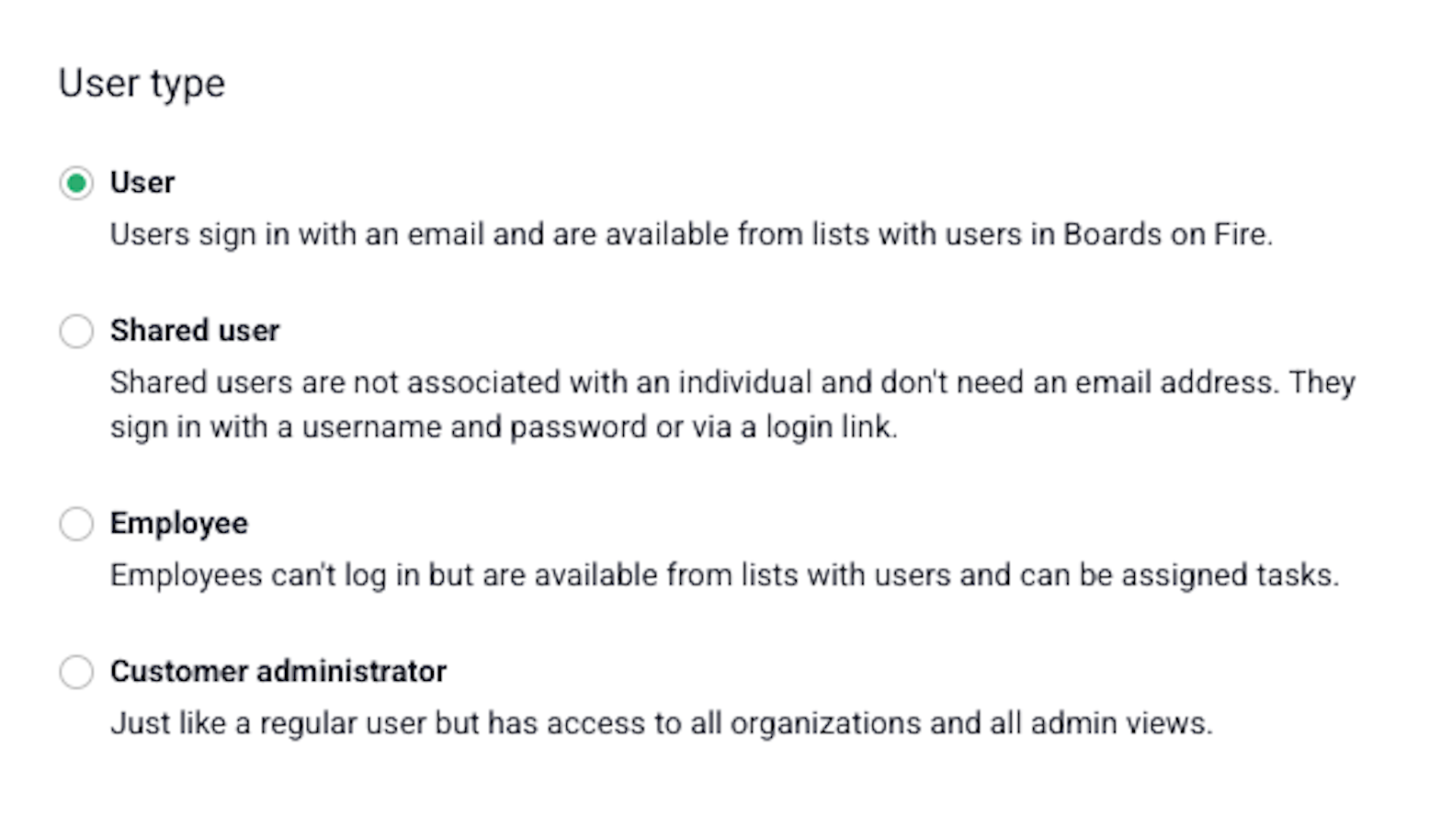 There are four different user types in Boards on Fire, and the one you choose determines which functionality you will have access to in your environment.