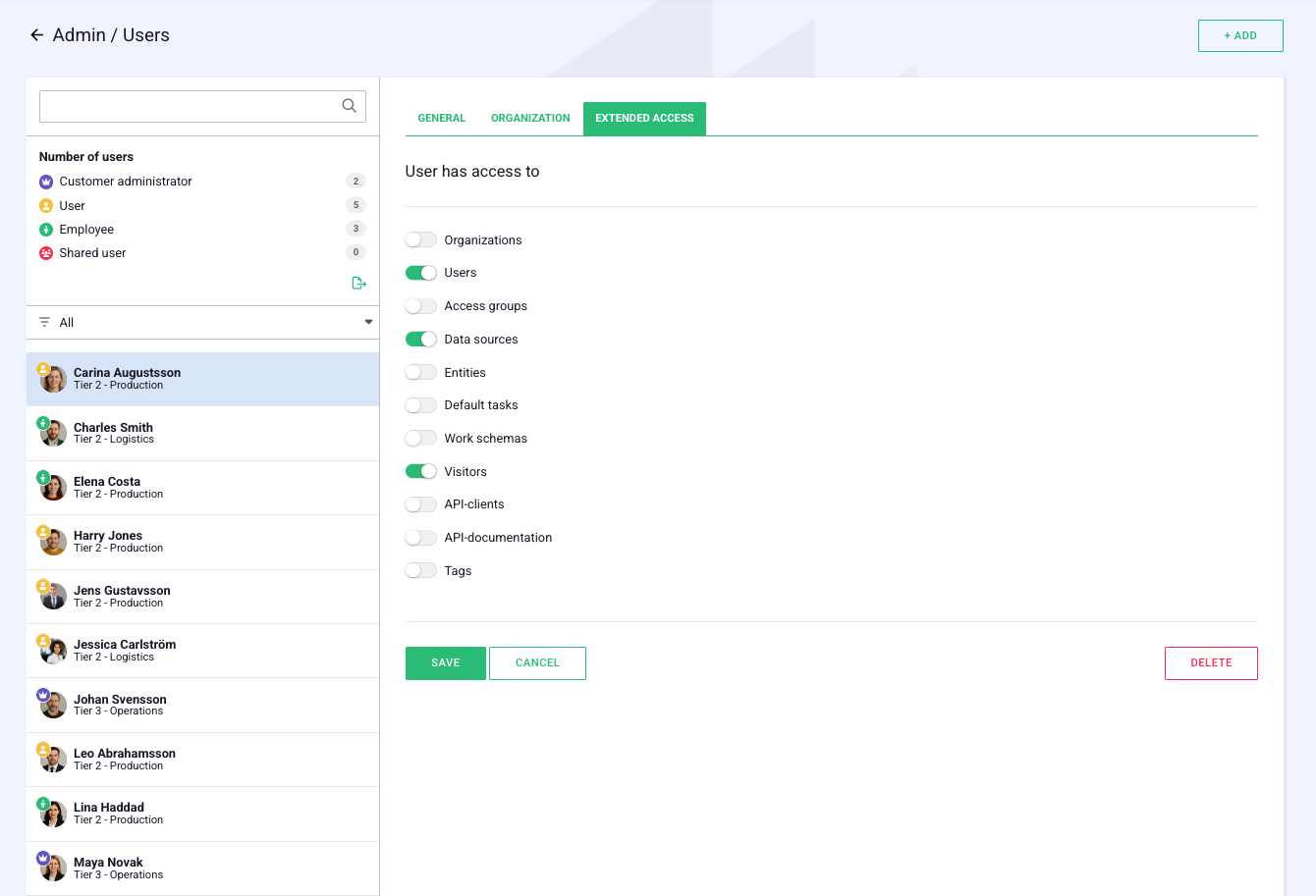 For this reason, it is possible to manage extended access for each individual user. Here, a customer administrator can control whether the user is allowed to, for example, create new data sources, add more users, or edit access groups.