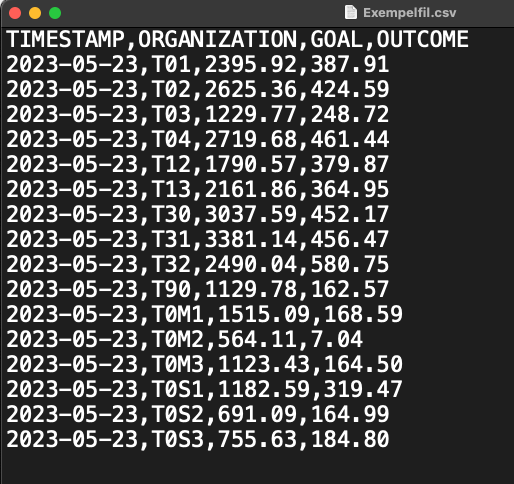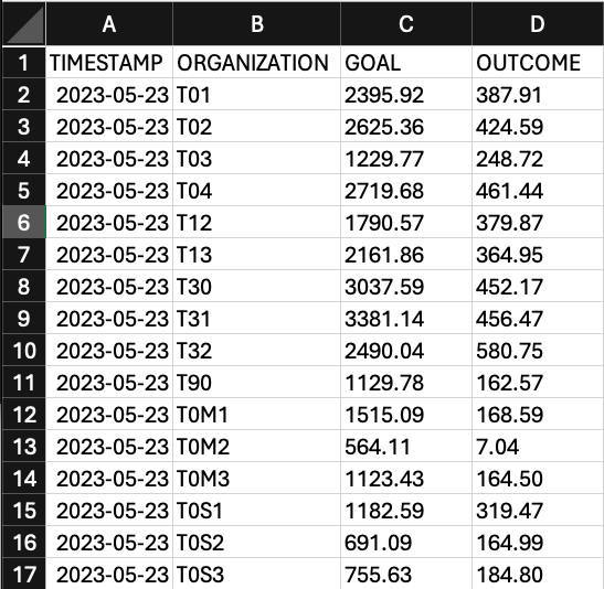 In a .csv file, each row represents a date for an organization in BoF. In the example, the fields "GOAL" & "OUTCOME" have the values 1229.77 and 248.72 respectively for the date 2023-05-23 in the organization "T03".
