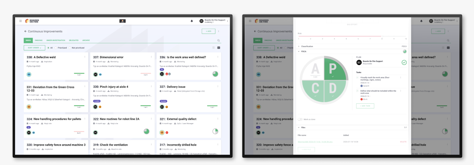 Boards on Fire’s digital solution for daily management consolidates all essential information into easy-to-read digital boards that can be displayed on screens throughout the factory. By visualizing production status in real time, teams gain immediate visibility into deviations, bottlenecks, ongoing activities, and KPIs. This enables proactive action rather than last-minute reactions, reducing the risk of delays and quality issues.