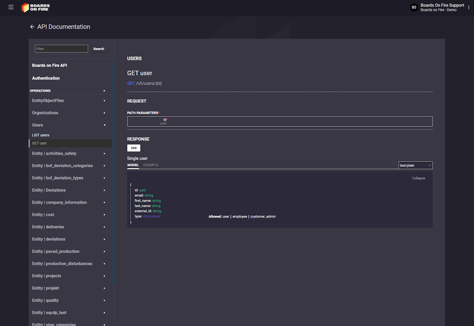 The Boards on Fire API is built on REST principles using JSON as content type. The full reference of the REST API is available in the format of Open API and is dynamically generated for each customer.