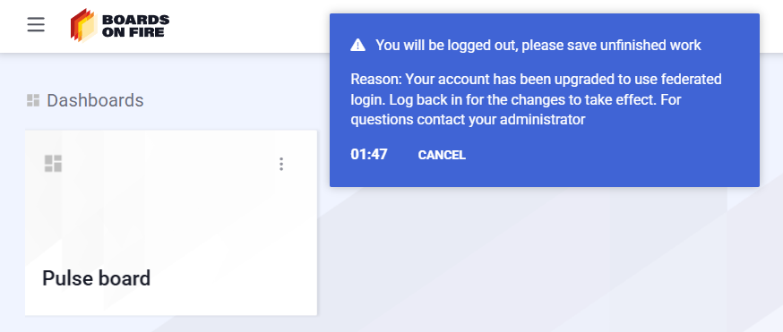 Once SSO is activated, all currently logged-in users will be prompted to log out and then log in again using federated authentication.