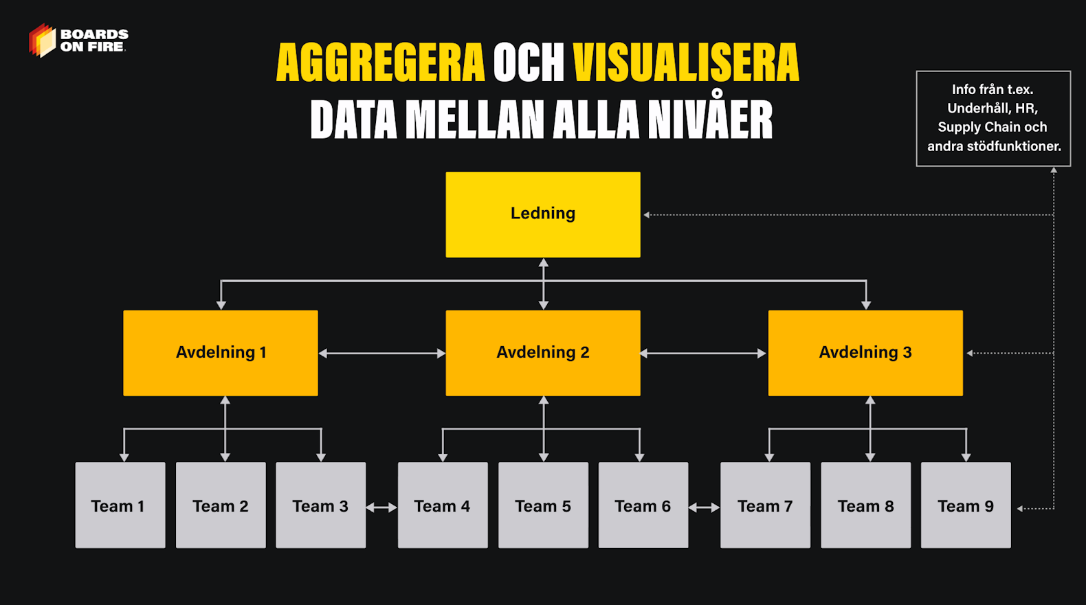 Boards on Fire är ett flexibelt verktyg som kan anpassas helt efter era behov och önskemål, inklusive hur information och nyckeltal visas på era skärmar. Dessutom möjliggör plattformen att organisera information både uppåt och nedåt i organisationen. Ledningen kan enkelt följa teamens arbete, delegera uppgifter och identifiera framgångsfaktorer eller förbättringsområden.