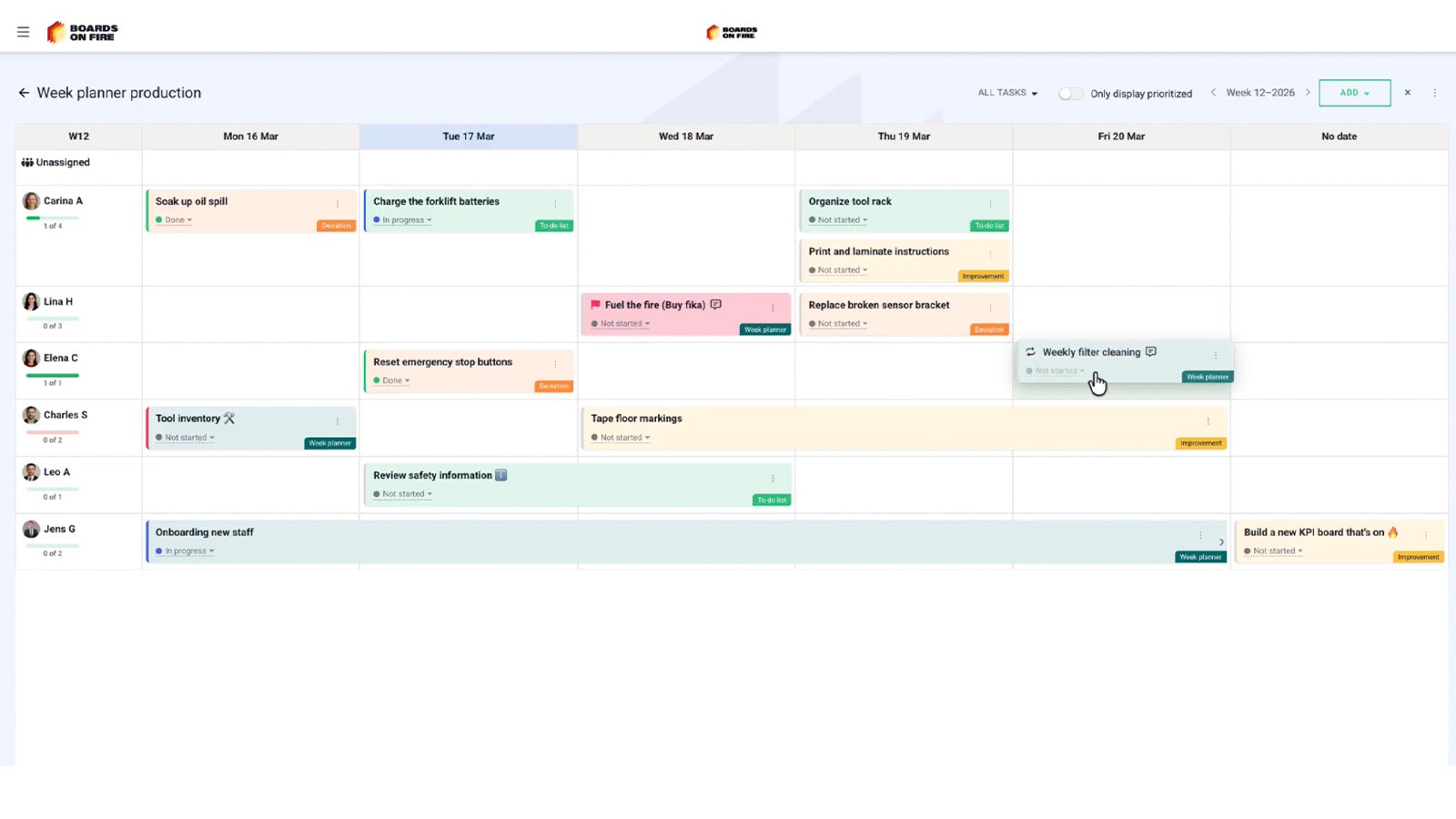 Med Veckoplanering i Boards on Fire får ni en tydlig veckovy där ansvar, prioriteringar och uppgifter som kräver extra uppmärksamhet syns direkt. Uppgifter som inte slutförs i tid markeras tydligt, så inget faller mellan stolarna.