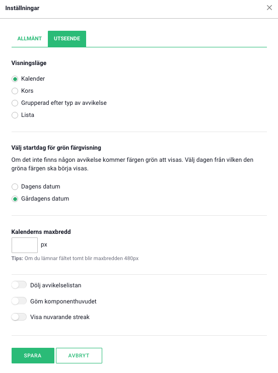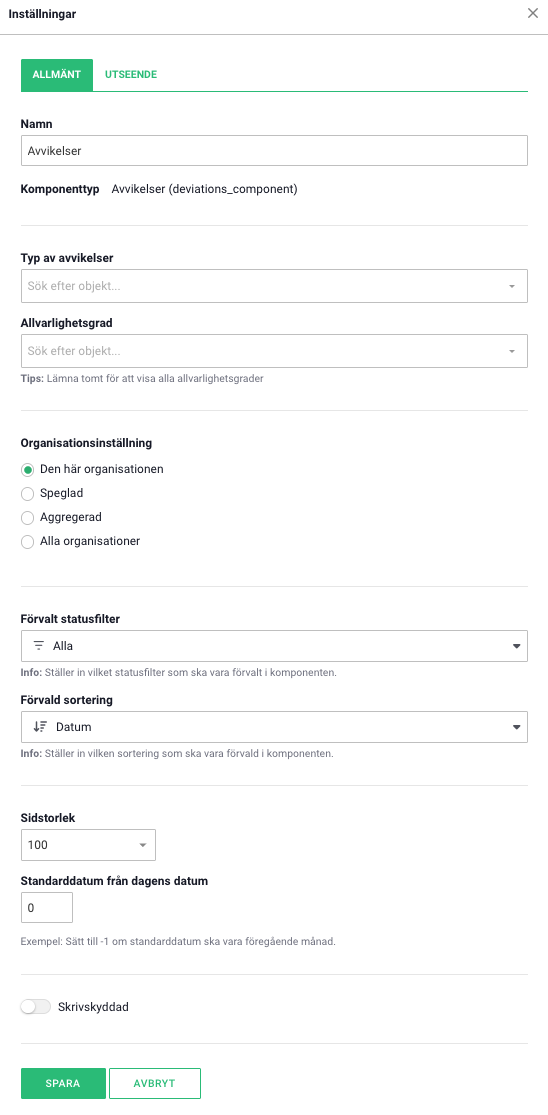 När ni klickar på "Avvikelse-komponent" i komponentmenyn får ni upp en ruta med en knapp för inställningar. Klicka på knappen för att öppna inställningarna, som visas i nästa bild.