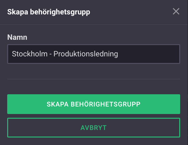 Först ger ni behörighetsgruppen ett namn. Namnet bör beskriva vad den ger tillgång till, alternativt vilka som ska ingå i den.