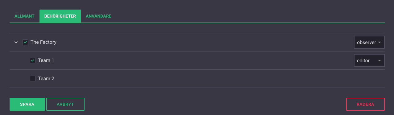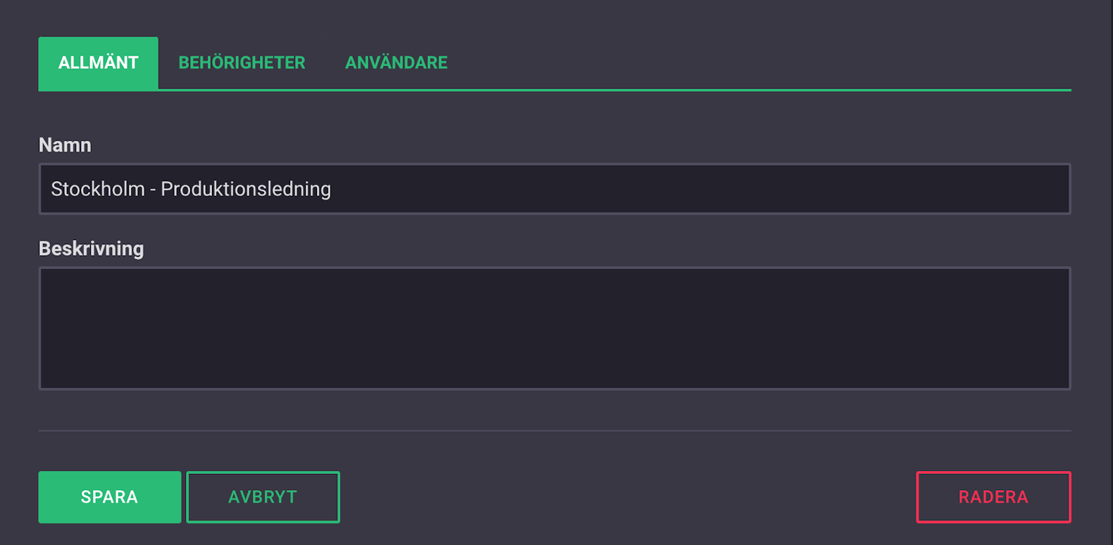Här finns de allmäna inställningarna för behörighetgruppen. Ni kan redigera behörighetsgruppens namn samt beskriva vad den ska användas för.