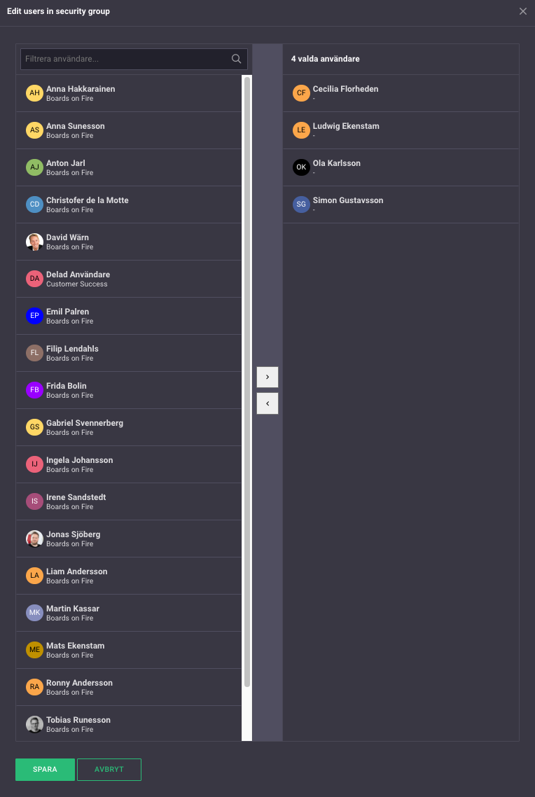 I den vänstra spalten syns en lista på alla användare i er miljö. I den högra de användare som ingår i behörighetsgruppen. För att lägga till eller ta bort en användare från behörighetsgruppen kan ni dra användaren mellan spalterna, alternativt markera en/flera och klicka på pilarna i mitten.