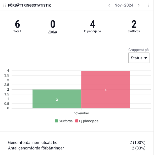 Att arbeta med ständiga förbättringar skapar en kultur av utveckling och kvalitet inom organisationen. Genom att använda statistik kan ni på ett konkret sätt mäta framgångar, identifiera förbättringsområden och följa upp resultat över tid. Statistiken gör förbättringsarbetet mer transparent och underlättar beslutsfattande och prioritering av resurser. Dessutom ger det er möjligheten att visualisera framsteg och engagera medarbetare i arbetet mot gemensamma mål.