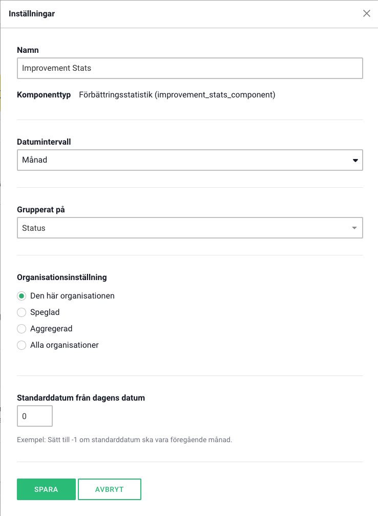 I komponentens inställningar kan ni välja det datumintervall som ska visas, med alternativen dag, vecka, månad, kvartal och år. Här kan ni också ange hur ni vill gruppera förbättringarna.