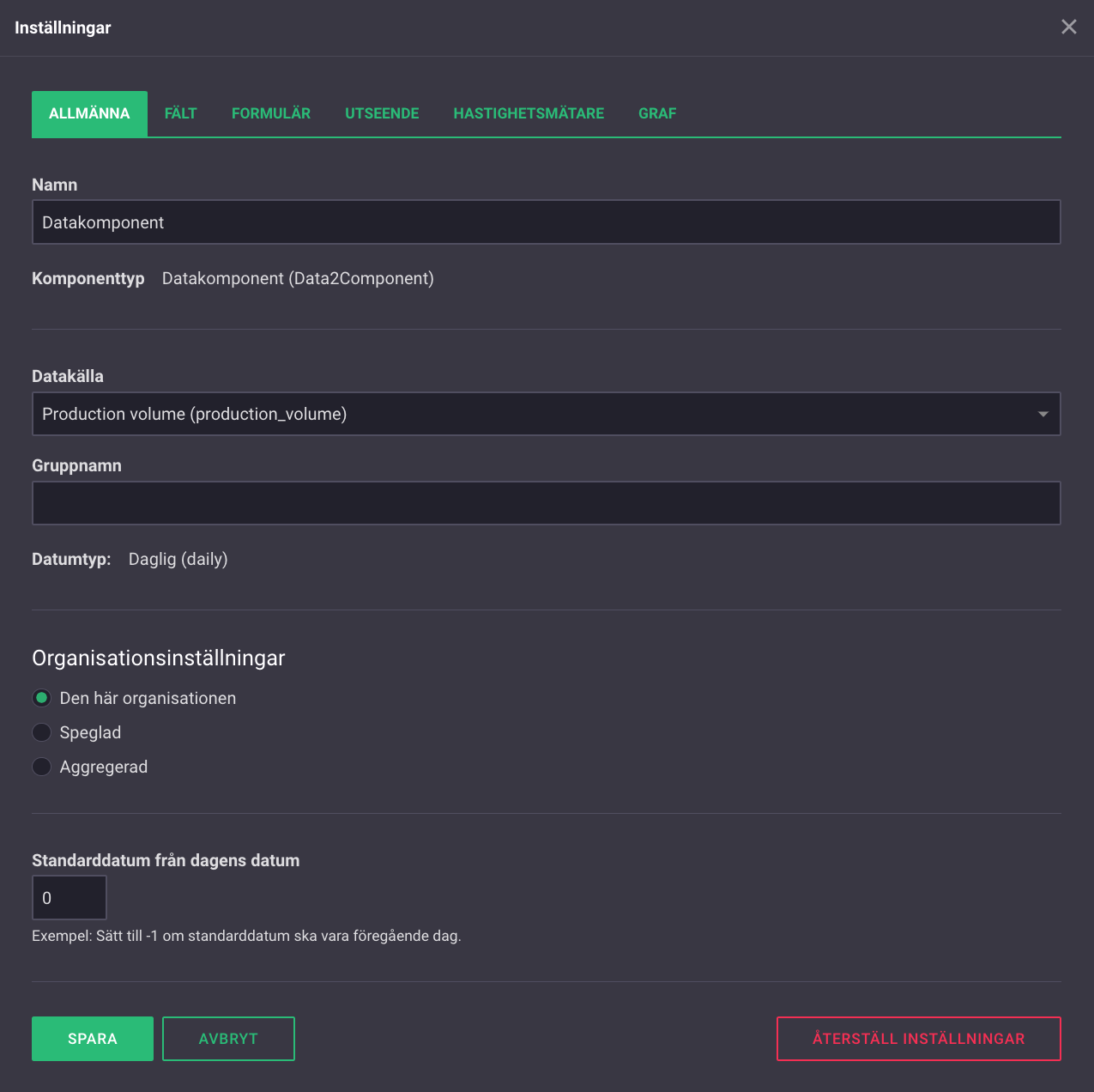 Här hittar du de "allmänna inställningarna" för datakomponenten.