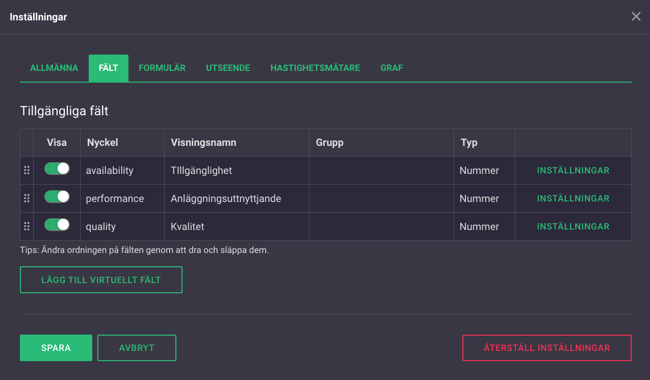 Klickar du på "inställningar" till höger får du upp en ruta med inställningar för det enskilda fältet.