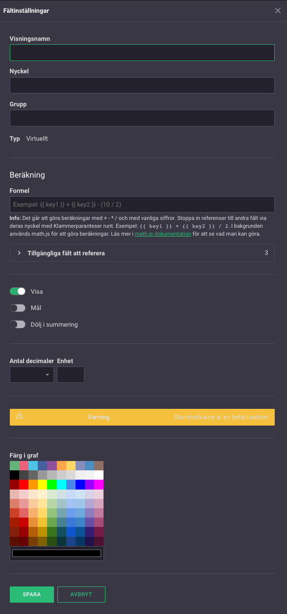 Klickar du på "Lägg till virtuellt fält" får du upp inställningar för ett nytt virtuellt fält (se bild nedan). Ett virtuellt fält är en beräkning av ett eller flera andra fält och kan därför inte aggregeras/speglas. Det går inte heller att skriva i värdet i ett virtuellt fält.