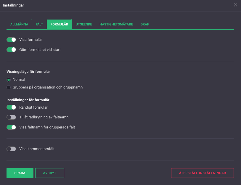- Under "Visa" kan du bocka i/ur vilka fält som ska synas i formuläret/grafen.
