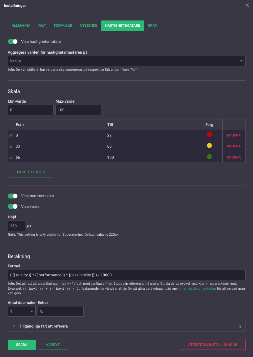 - I fältet "Formel" skriver du i den formel hastighetsmätaren ska få sitt värde genom. Regler för formeln står under fältet. Du kan även klicka på länken i infotexten för ytterliggare dokumentation.