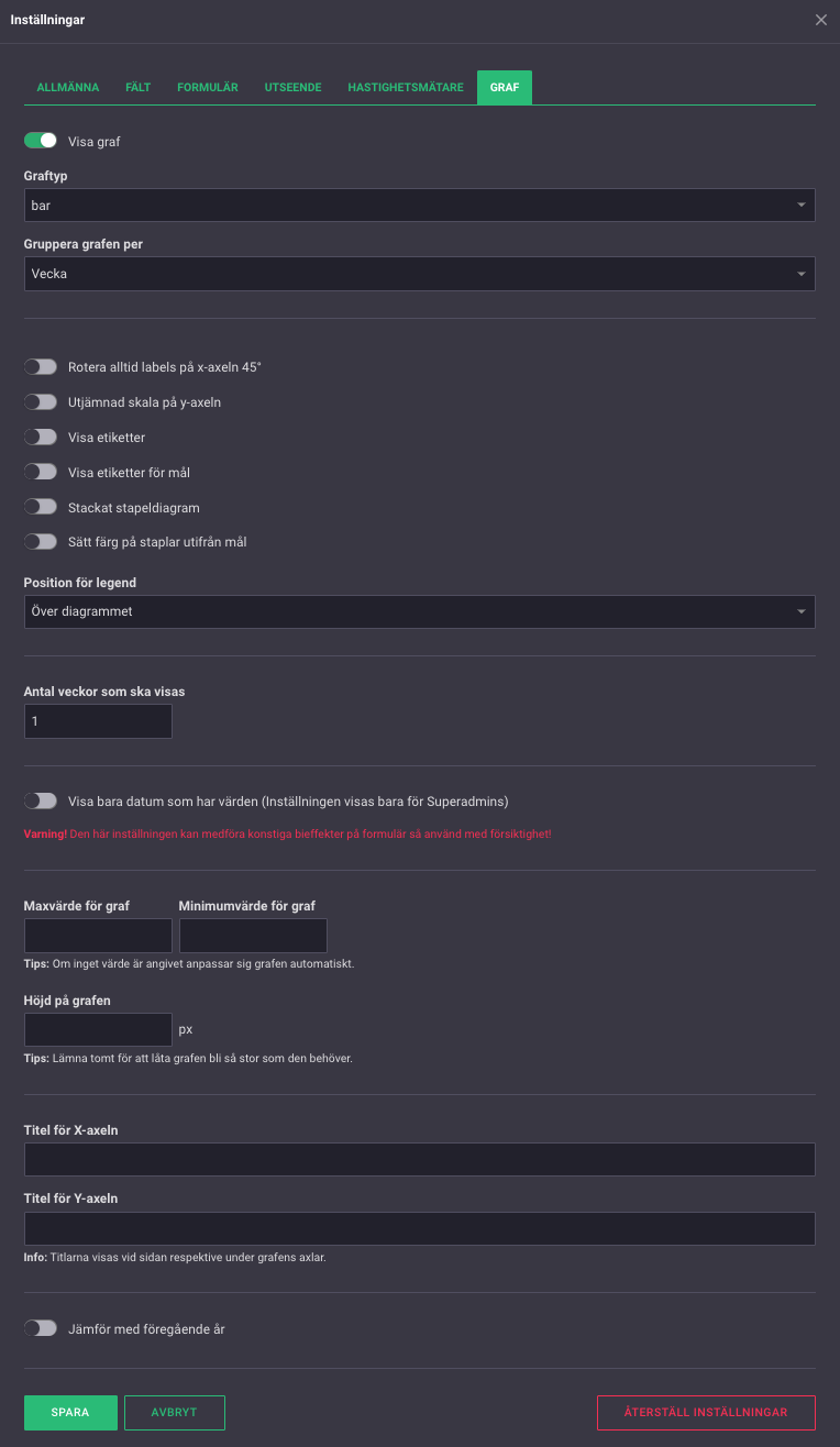 - I fältet "Gruppera grafen per" kan du välja om grafen ska slå ihop en veckas/månads/års/osv data. Datan kommer då grupperas enligt "Aggregeringsfunktionen" i var fälts inställningar.