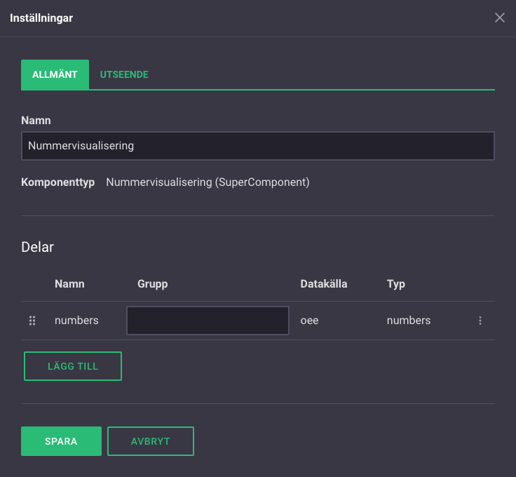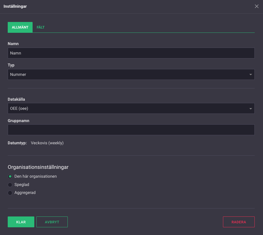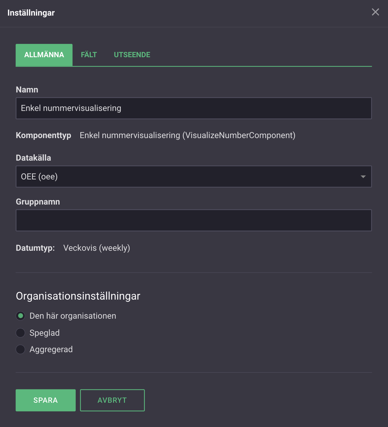 - Väljer du "Nummer" som typ ändras fliken "Allmänt" något (se bild nedan). I fältet "Datakälla" väljer du vilken datakällas värden du vill visa i din nummervisualisering. I fliken "Gruppnamn" kan du välja ett gruppnamn för din komponent. Under "Organisationsinställningar" kan du välja om komponenten ska spegla/aggregera data från andra organisationer. För mer information kring gruppnamn och organisationsinställningar kan du bläddra upp på sidan till informationen om datakomponenten. Du ser även att inställningarna har fått en ny flik, "Fält". Här ställer du in hur datan ska visualiseras i komponenten. Informationen för fliken "Fält" i avsnittet om datakomponenten applicerar även här.