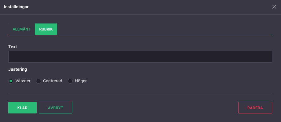 - Väljer du "Rubrik" får du upp en till flik i inställningarna med namnet "Rubrik" (se bild nedan). I fältet "Text" väljer du vad det ska stå i din rubrik och under "Justering" väljer du positionen av rubriken.