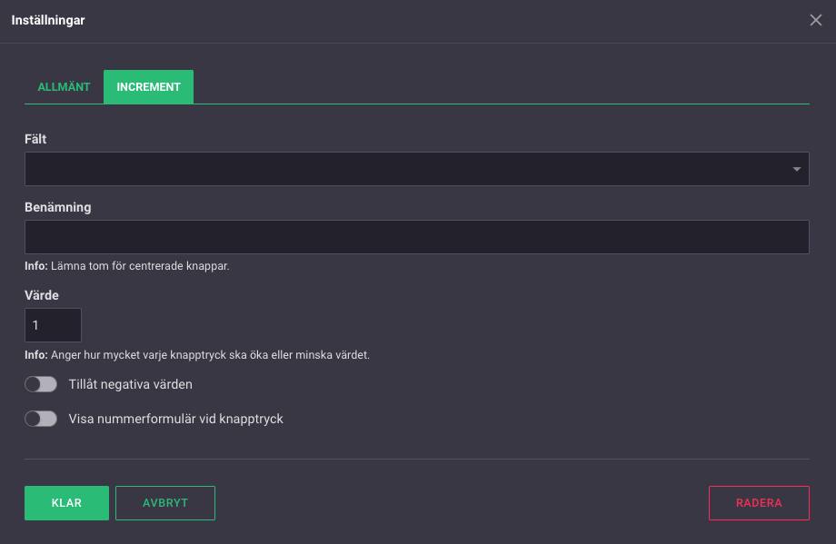 - Väljer du "Increment" som typ kommer fliken "Allmänt" se likadan ut som vid typen "Nummer". Inställningarna har däremot fått en ny flik, "Increment" (se bild nedan). En flik av typen Increment ger dig möjlighet att ändra ett fälts värde med förvalda ökningar genom plus/minus-knappar. I rutan "Fält" väljer du vilket av datakällans fält som ska ändra värde genom knapparna. I rutan "Benämning" kan du ge knapparna ett namn. I fliken "Värde" väljer hur stor ökningen/minskningen ska vara vid varje knapptryckning. Klickar du i knappen "Tillåt negativa värden" kan du "trycka ner" värdet på fältet under noll. Klickar du i knappen "Visa nummerformulär vid knapptryckning" kommer ett formulär att synas när en användare klickar på en av knapparna.