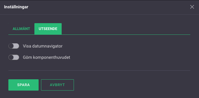 - Klickar du i "Göm komponenthuvudet" kommer komponentens namn samt datumnavigator vara gömd tills dess att en användare hovrar längst upp på komponenten med musen
