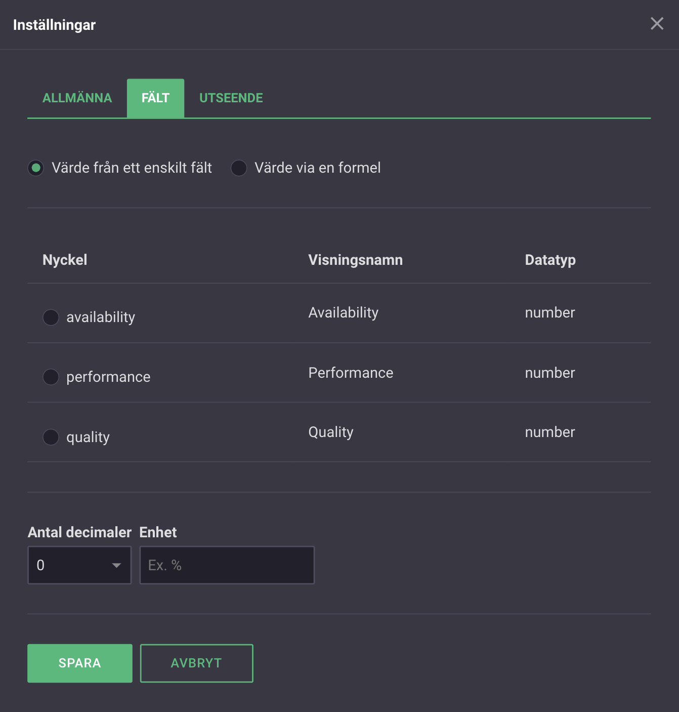 - I de översta knapparna kan du välja om du endast vill visa ett fält från datakällan eller ett nytt värde genom en formel av ett eller flera fält. Reglerna för formeln är desamma som för formlerna i hastighetsmätaren/virtuella fält.