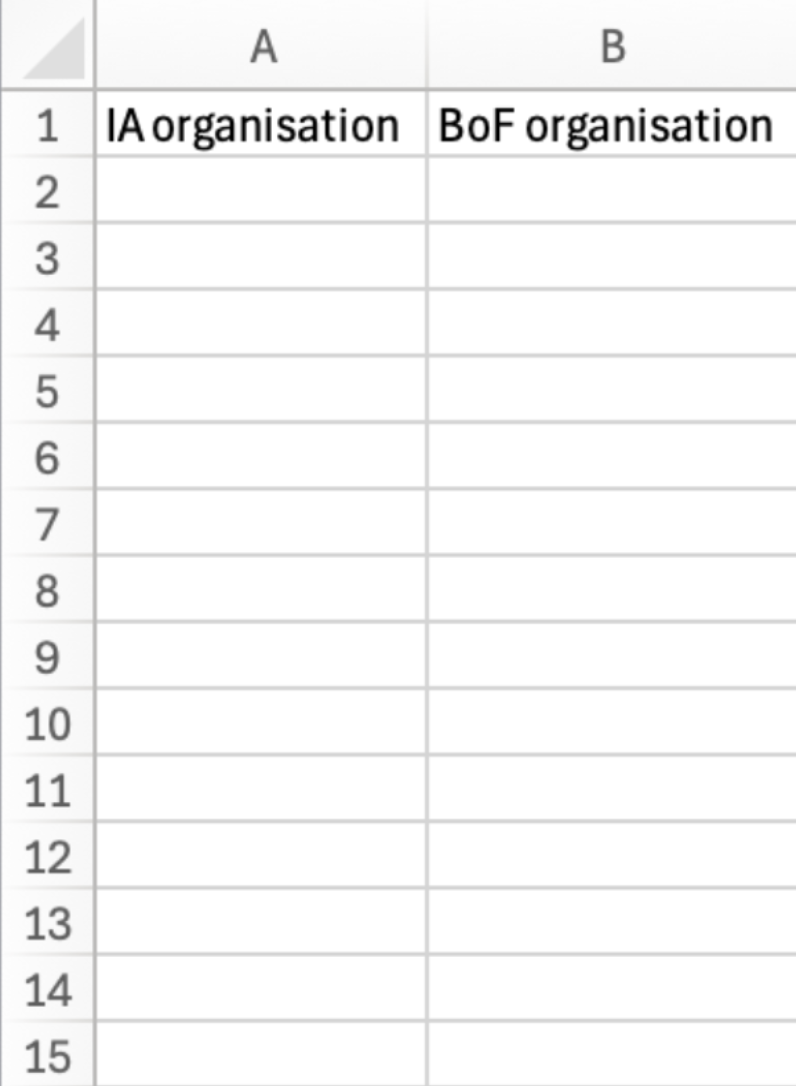 För att vi ska kunna genomföra mappningen av organisationer behöver den Excel-fil ni skickar innehålla följande kolumner: