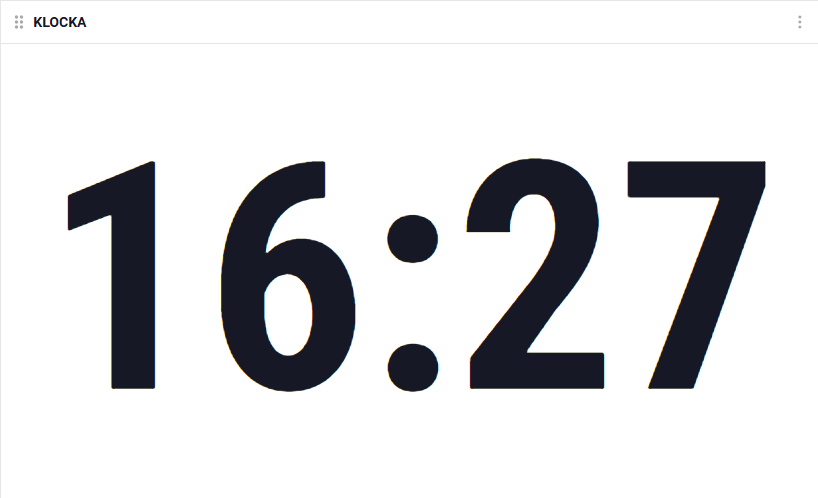 Klockkomponenten är ett praktiskt och användarvänligt verktyg som enkelt kan läggas till på din tavla för att visa aktuell tid. Den är synkroniserad med systemets klocka, vilket innebär att den alltid visar korrekt tid utan att vara bunden till en specifik tidszon. Detta gör den till ett flexibelt alternativ som fungerar smidigt oavsett var du befinner dig.