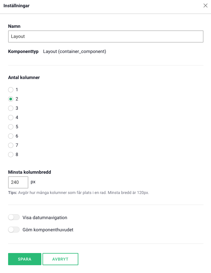 När ni klickar på de tre prickarna längst upp till höger på komponenten så får ni upp inställningarna. Här kan ni namnge layouten, välja antal kolumner, kolumnbredd samt att visa en datumnavigation.