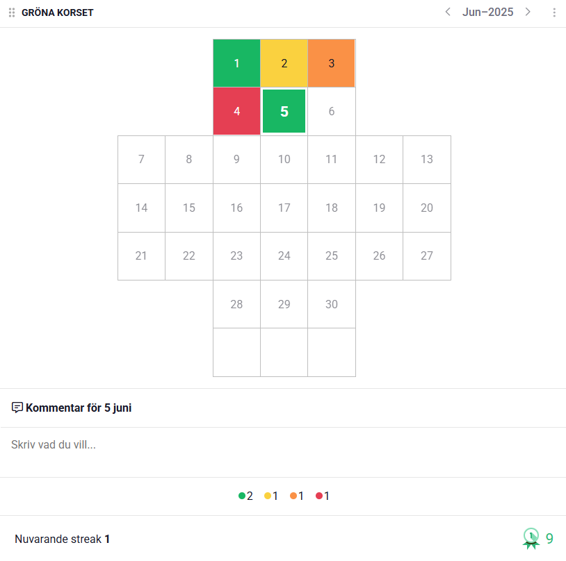 Här kan ni aktivera så att kommentarerna som lagts in på dagarna syns. Detta görs genom att ni aktiverar "visa kommentarer för vald dag". För att synliggöra hur många dagar av varje färg som loggats under månaden aktiverar ni "visa miniöversikt". En streak kan även aktiveras som visar hur många dagar det har gått i rad utan en röd dag och denna aktiveras genom att ni klickar i "visa nuvarande streak".