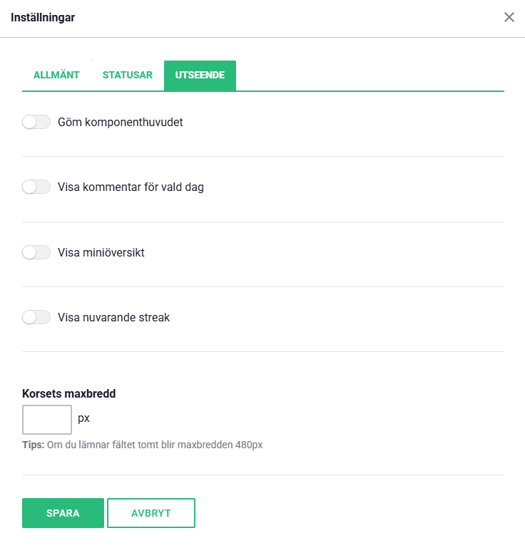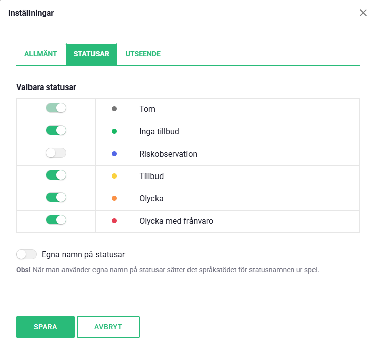 I inställningarna för denna komponent går det att namnge färgerna med valfria namn samt exkludera färger om så önskas. Det finns även förvalda alternativ för benämningarna om man vill använda sig av dessa. Inställningarna för att ändra namnet på färgerna hittar ni under rubriken statusar. För att namnge statusarna aktiverar ni knappen "egna namn på statusar" och sedan när det bara att skriva önskat namn i rutan där nuvarande namn står. För att dölja eller aktivera färgerna som visas klickar ni på knappen som visas bredvid dessa.