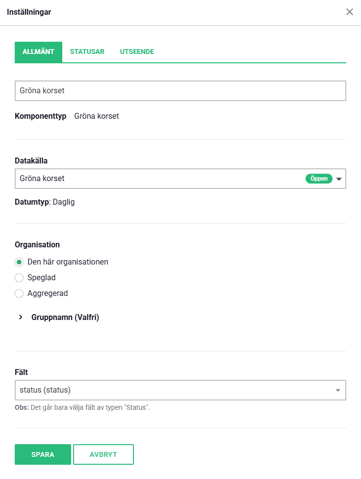 Datakällan för det gröna korset är redan förinställd, så du behöver inte oroa dig för att skapa den manuellt. Dessutom är ett statusfält automatiskt valt, eftersom du bara kan välja fält som har datatypen "status". Allt du behöver göra är att gå in på komponentens inställningar och klicka på "Spara" – och voilà, gröna korset är redo att användas!