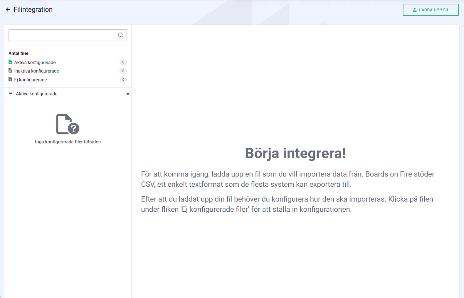 Du kan impotera data till Boards on Fire på två sätt: antingen direkt i det nya gränssnittet eller via ett SFTP-konto. Här går vi igenom hur du gör en manuell uppladdnig: